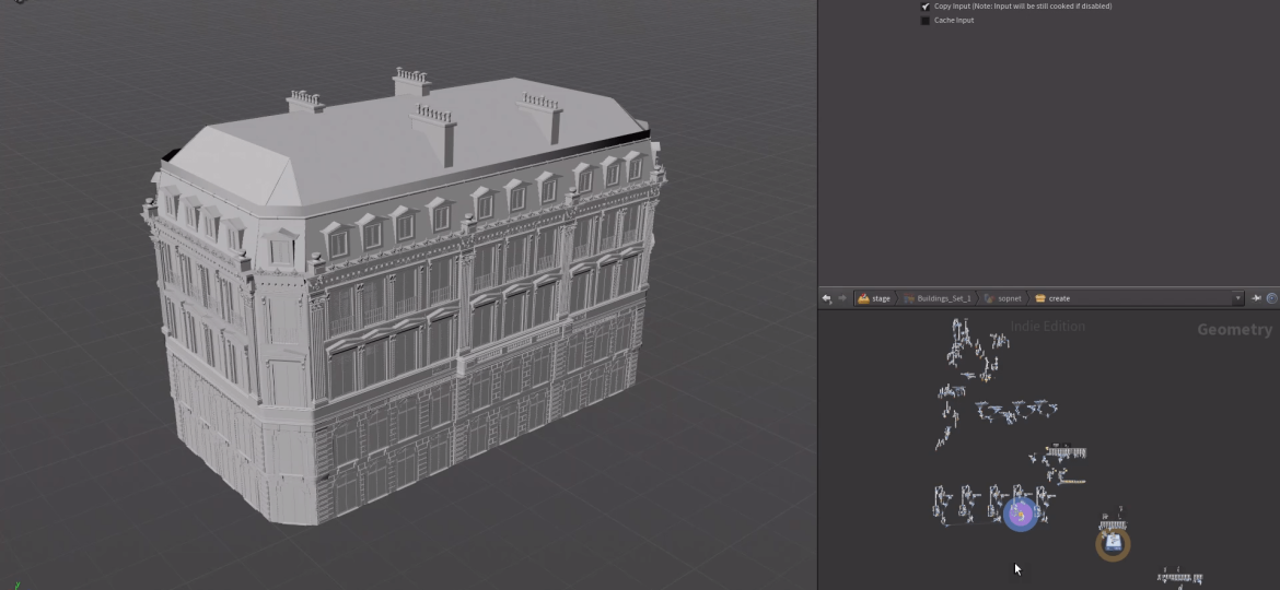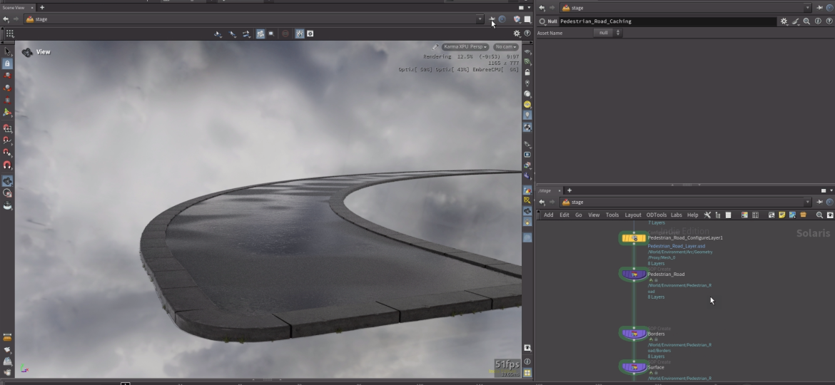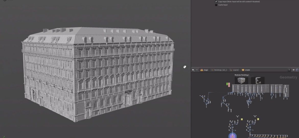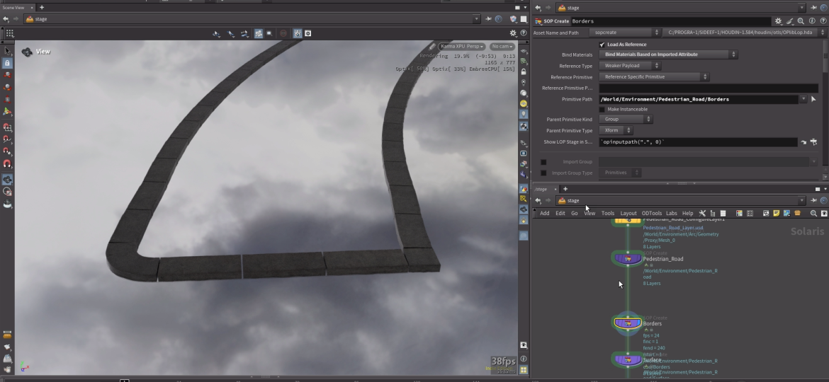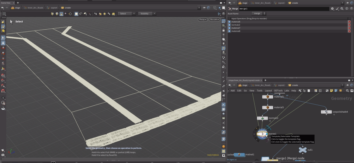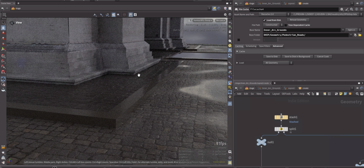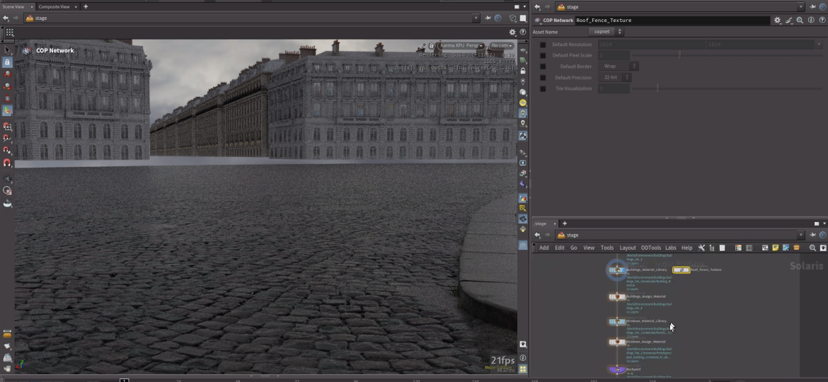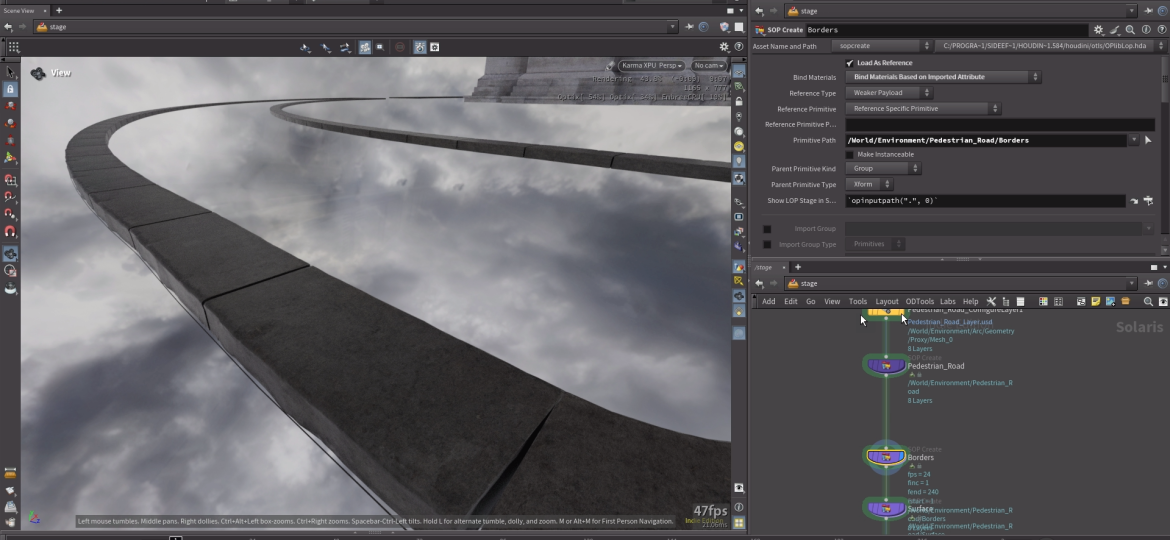 Curbs, asphalt pavers, and bollards were generated by instancing simple geometry along Houdini curves. Cobblestone displacement was handled at render time through a MaterialX shader driven by Megascans maps and procedural noise.