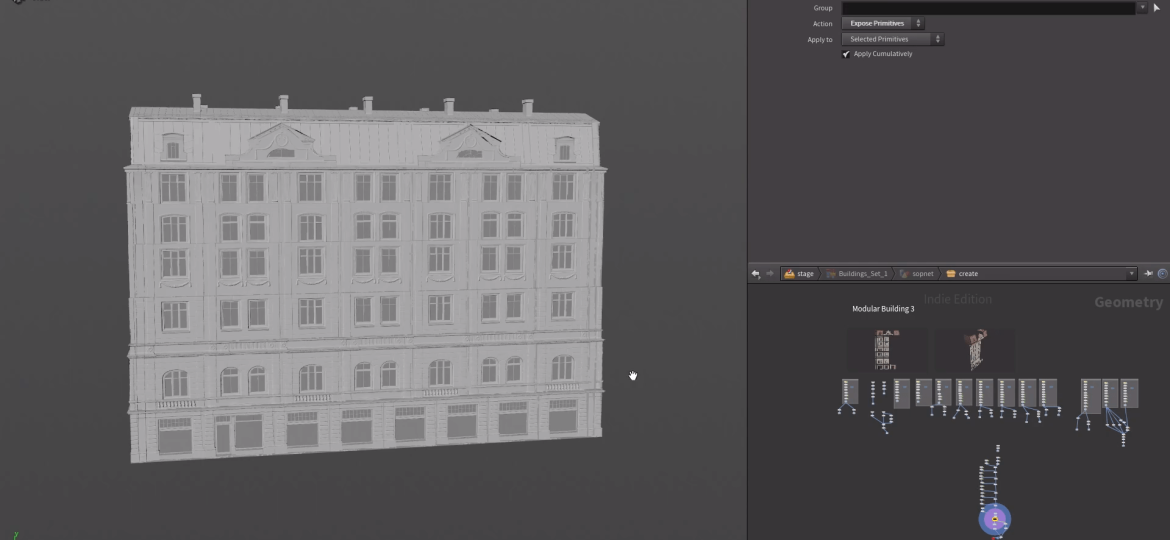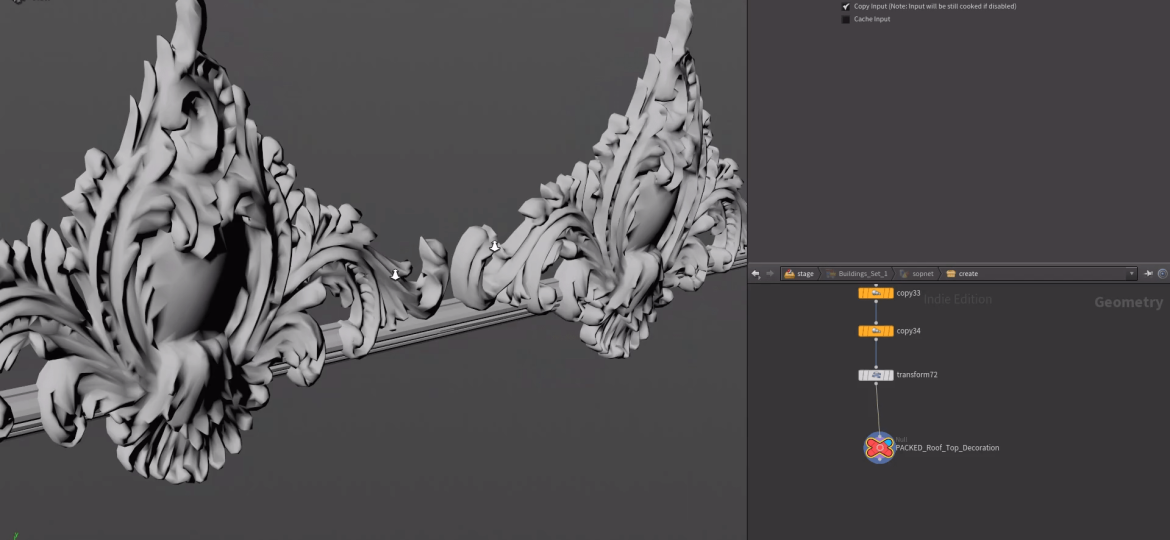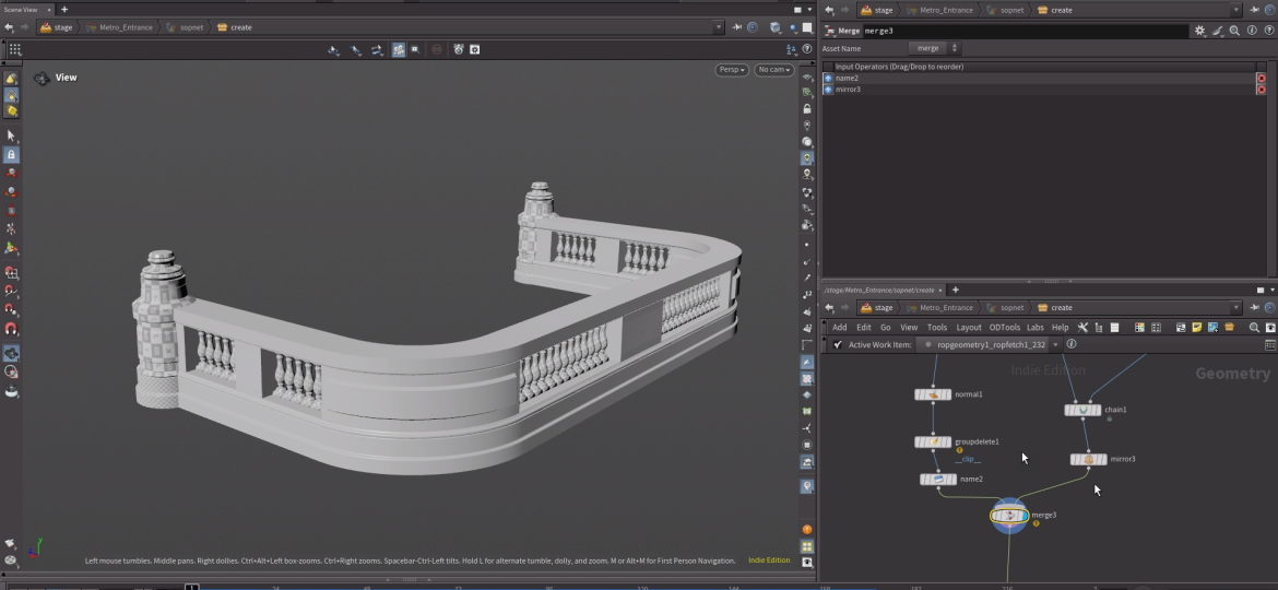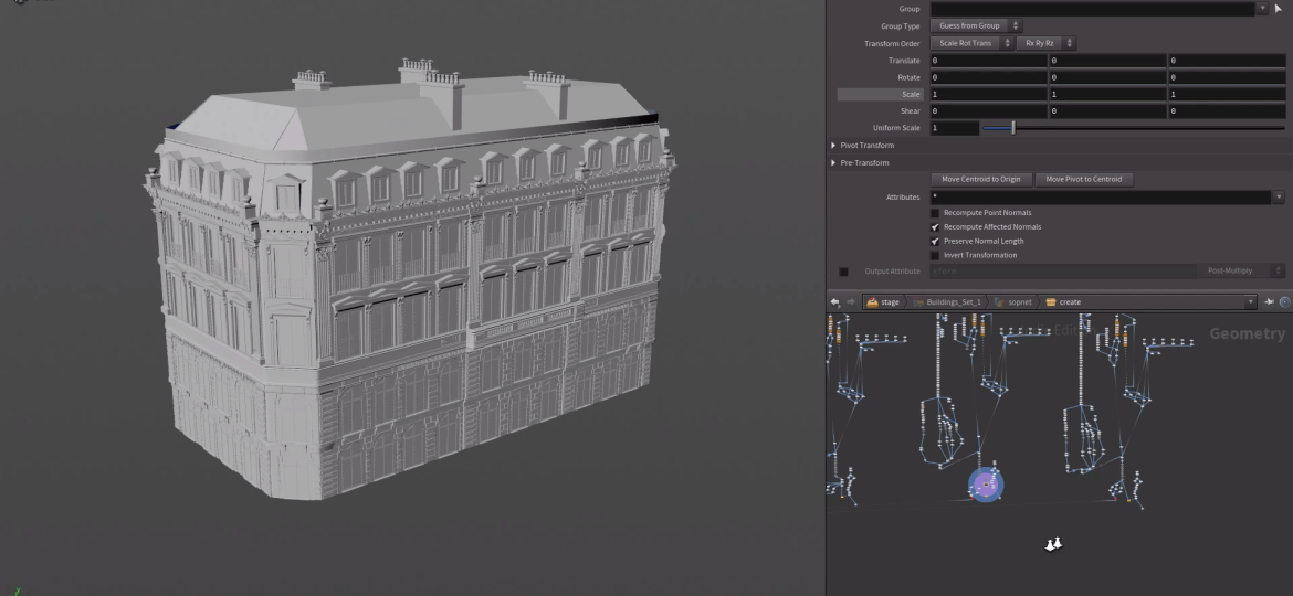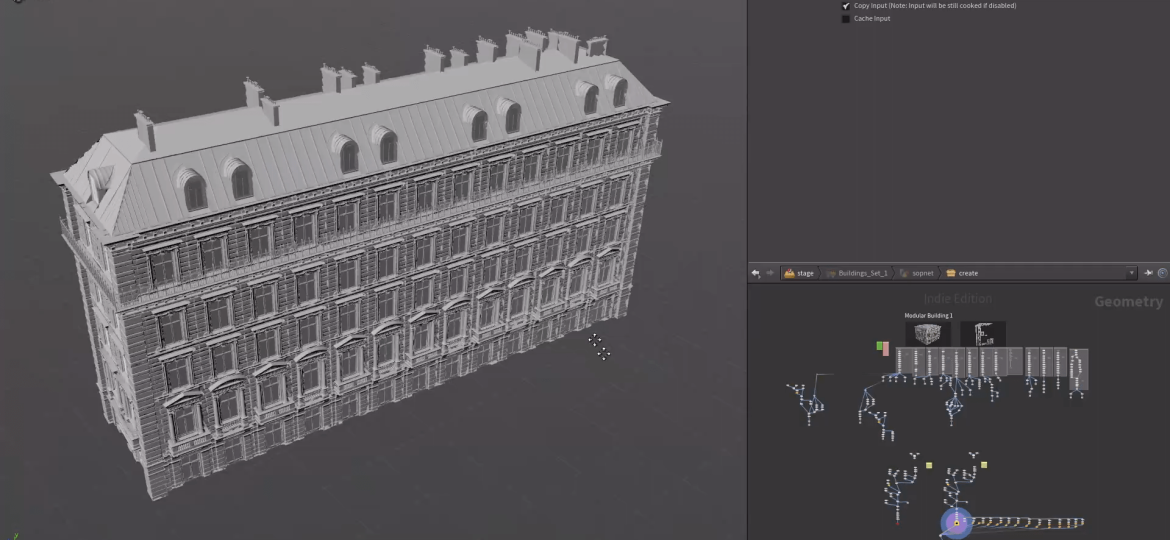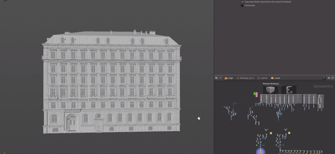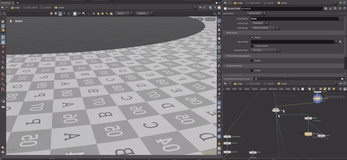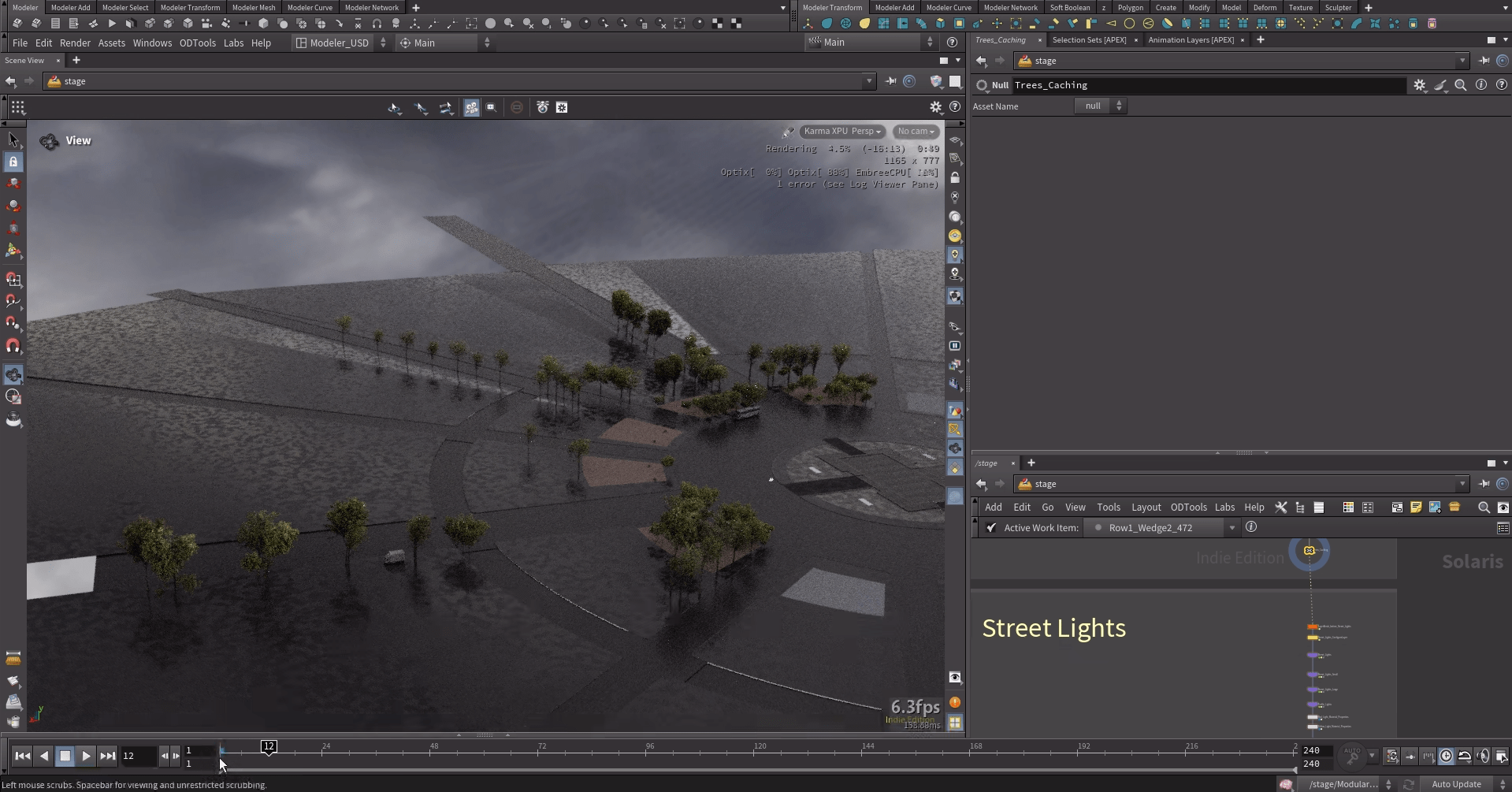 Curbs, asphalt pavers, and bollards were generated by instancing simple geometry along Houdini curves. Cobblestone displacement was handled at render time through a MaterialX shader driven by Megascans maps and procedural noise.