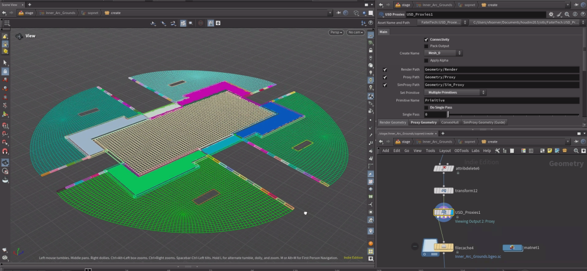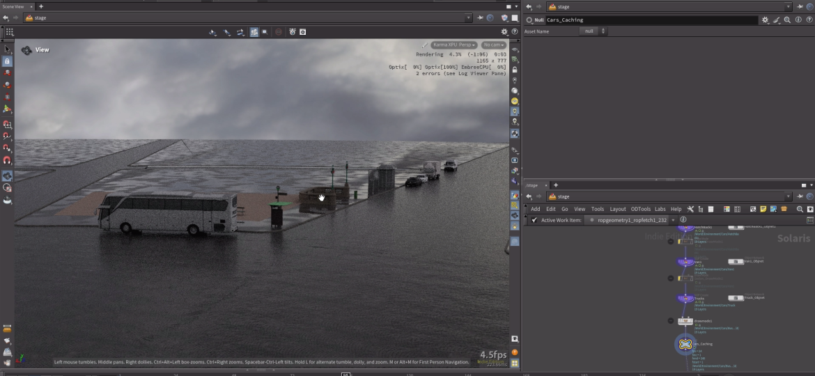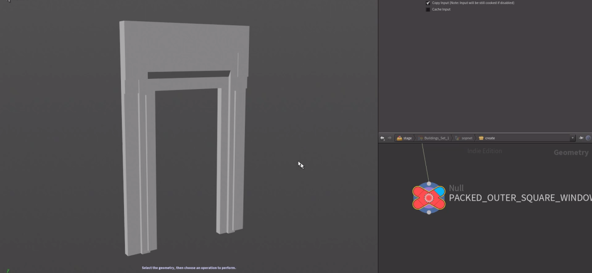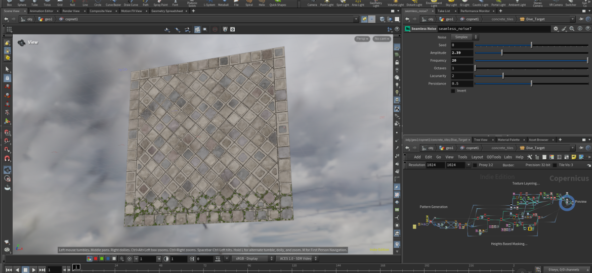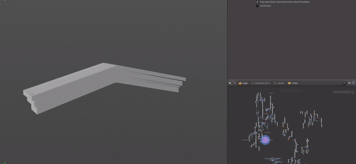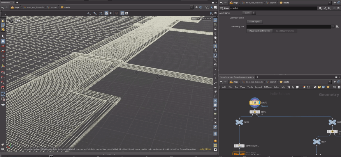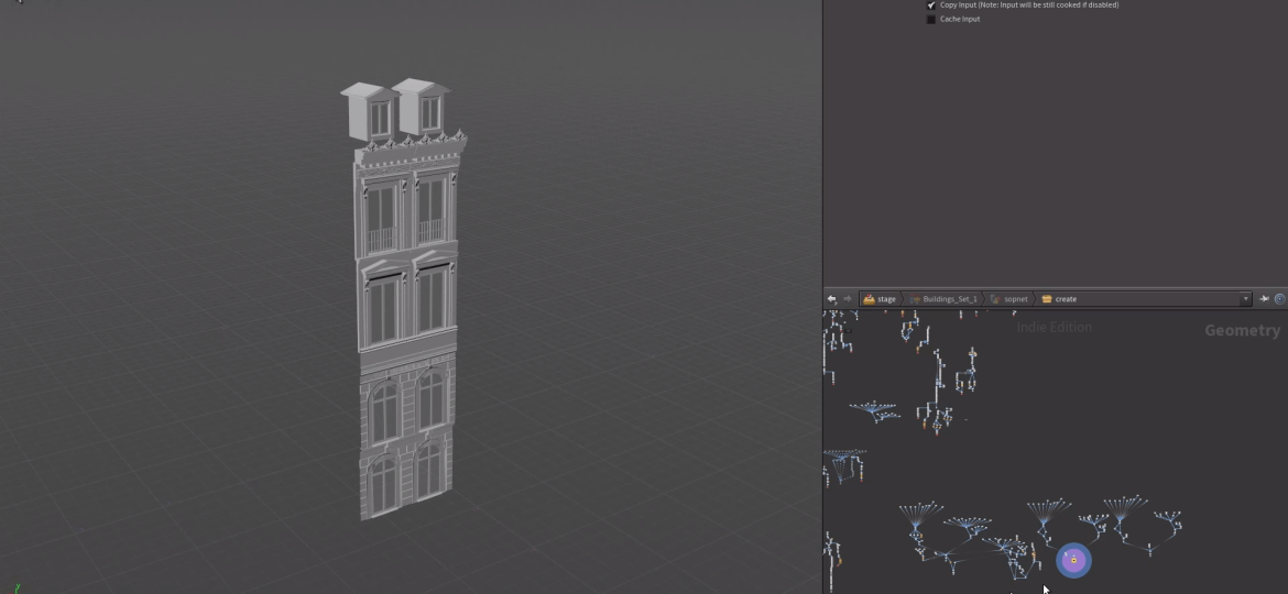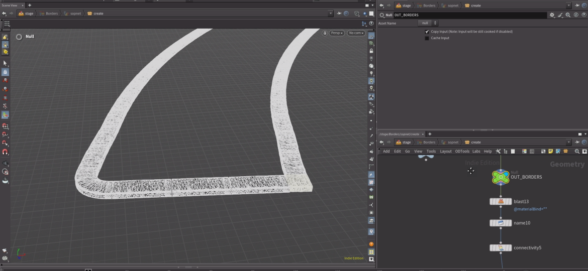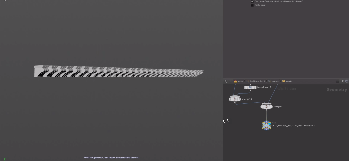 Curbs, asphalt pavers, and bollards were generated by instancing simple geometry along Houdini curves. Cobblestone displacement was handled at render time through a MaterialX shader driven by Megascans maps and procedural noise.