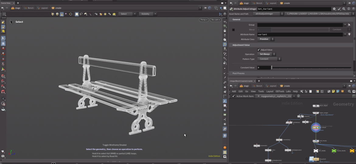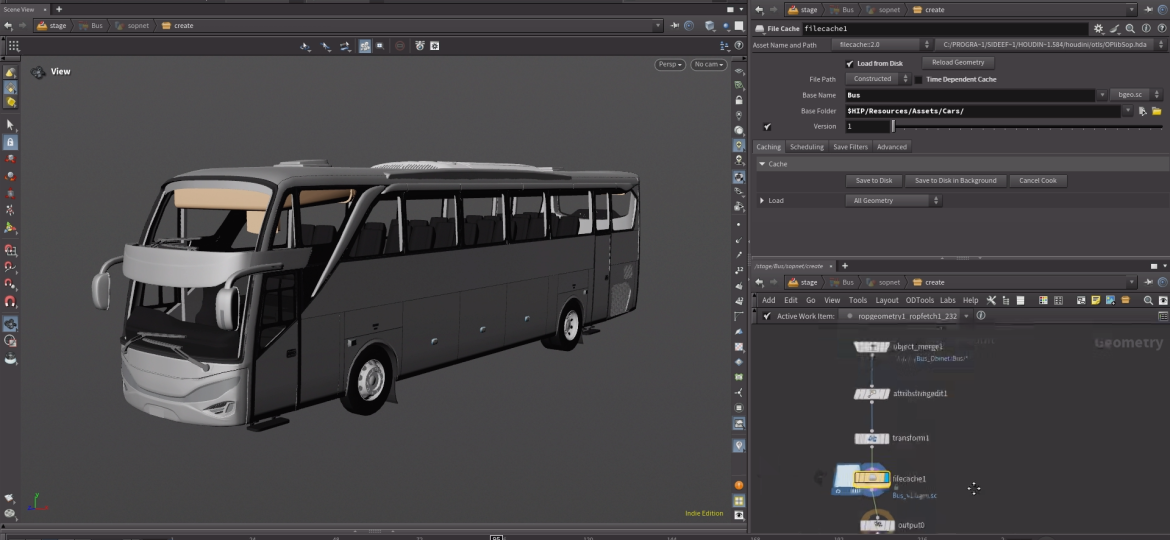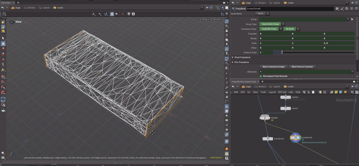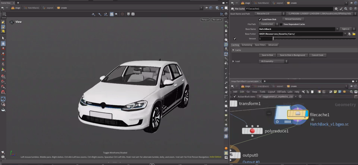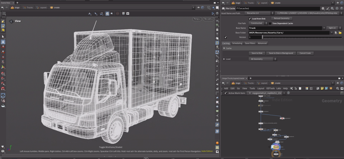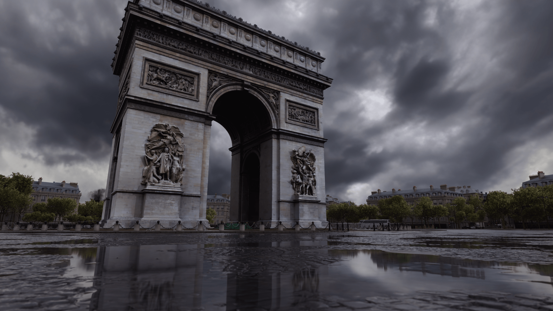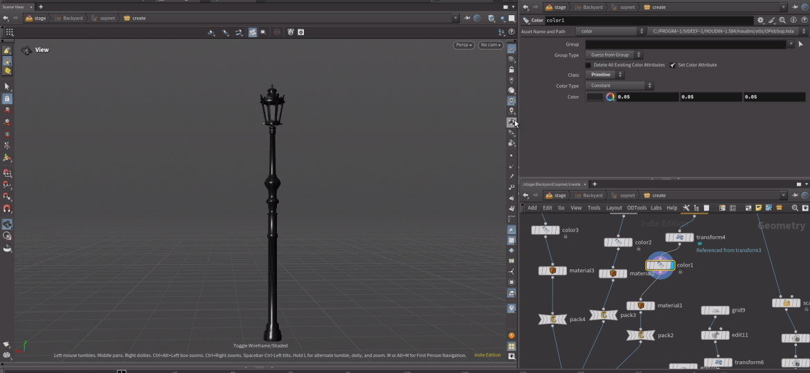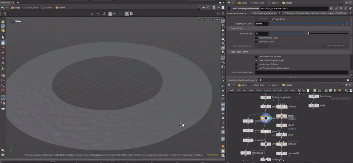 Curbs, asphalt pavers, and bollards were generated by instancing simple geometry along Houdini curves. Cobblestone displacement was handled at render time through a MaterialX shader driven by Megascans maps and procedural noise.
