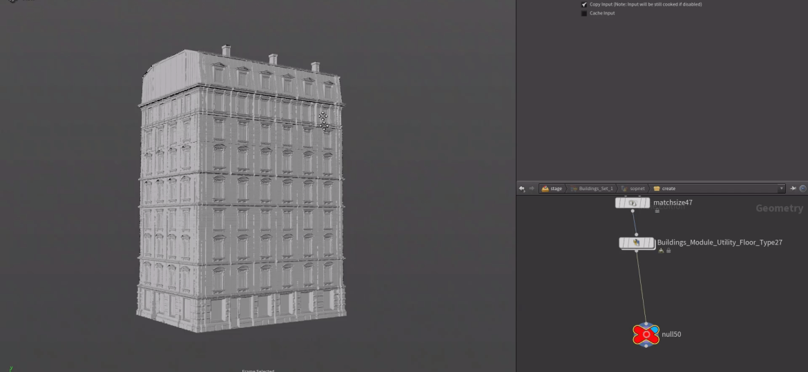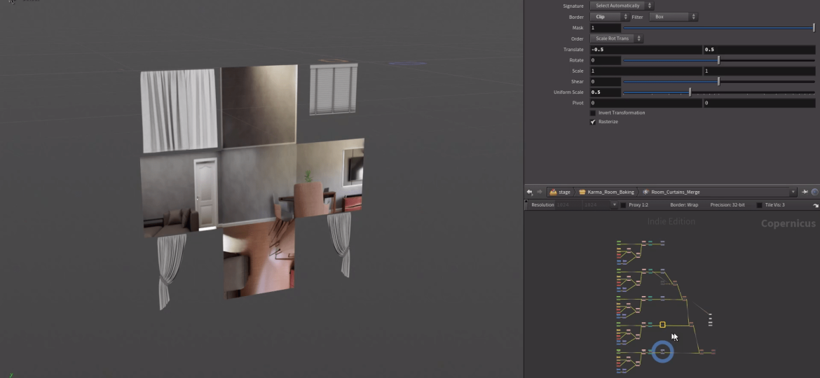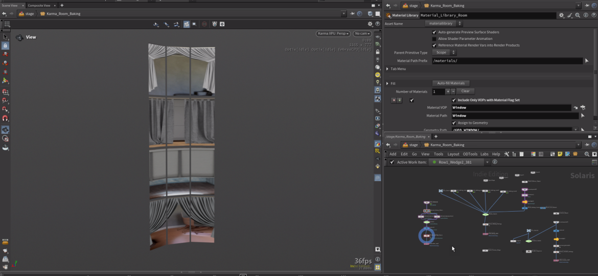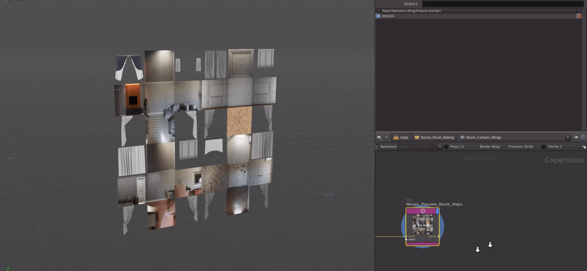 Room interiors were rendered externally in Blender with BlenderKit assets, then composited in Karma using Houdini’s Room Shader to simulate depth.
