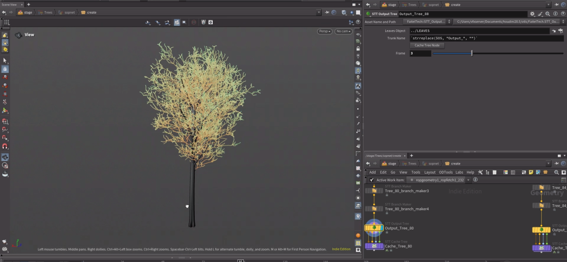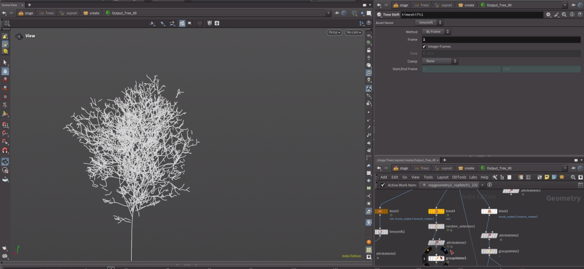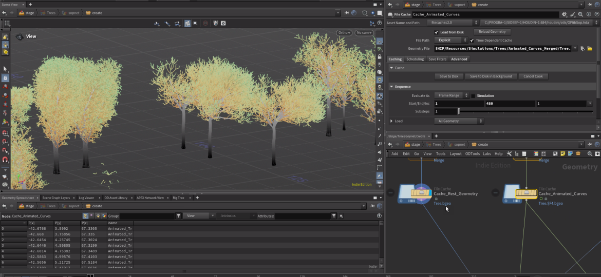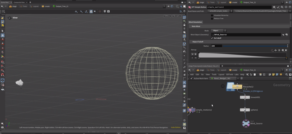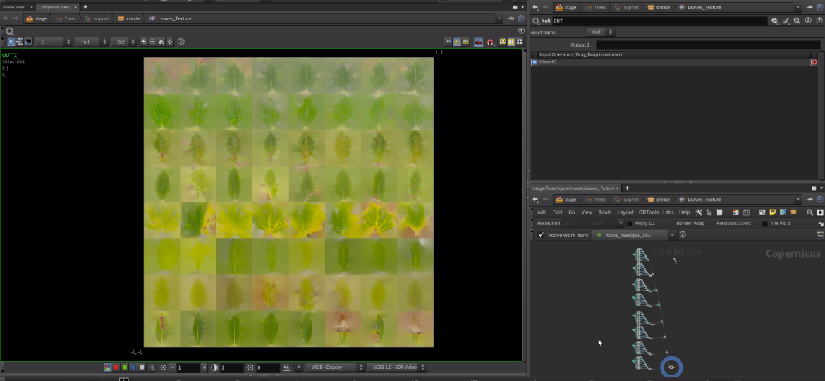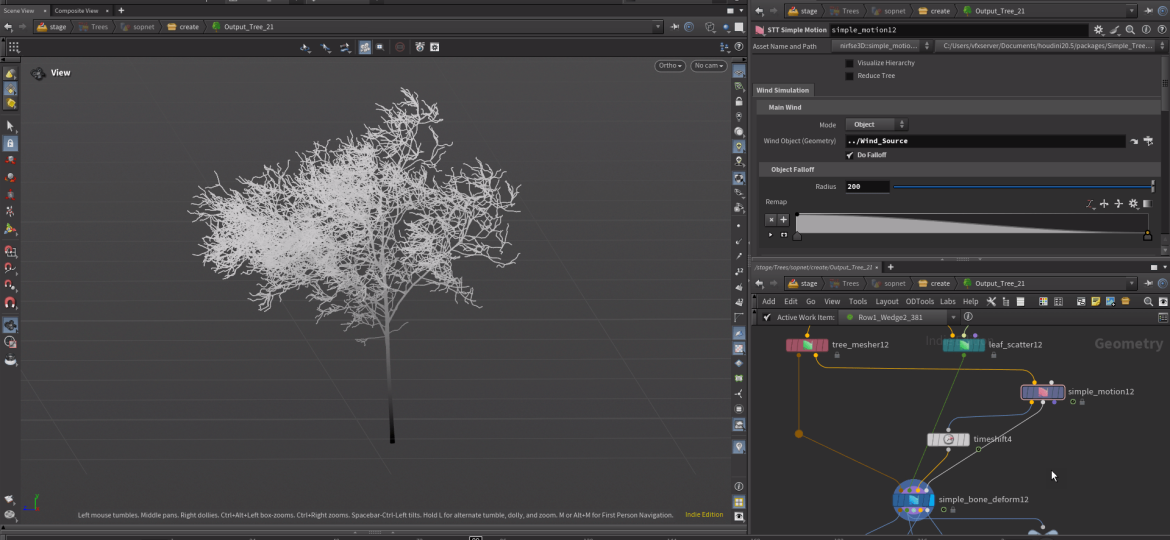 Wind animation was driven by procedural animation in SOPs with distance-falloff controls. Leaf atlases were assembled in COPs from Megascans textures.