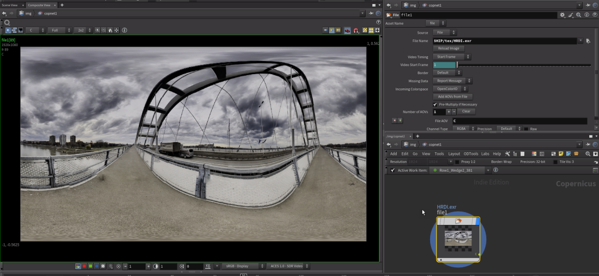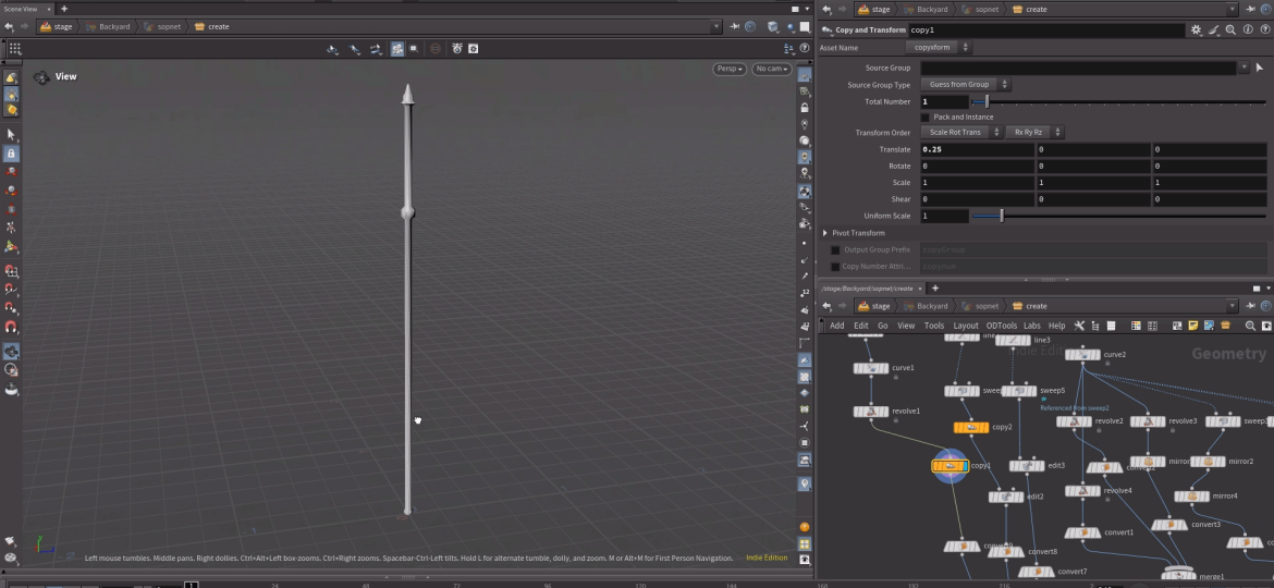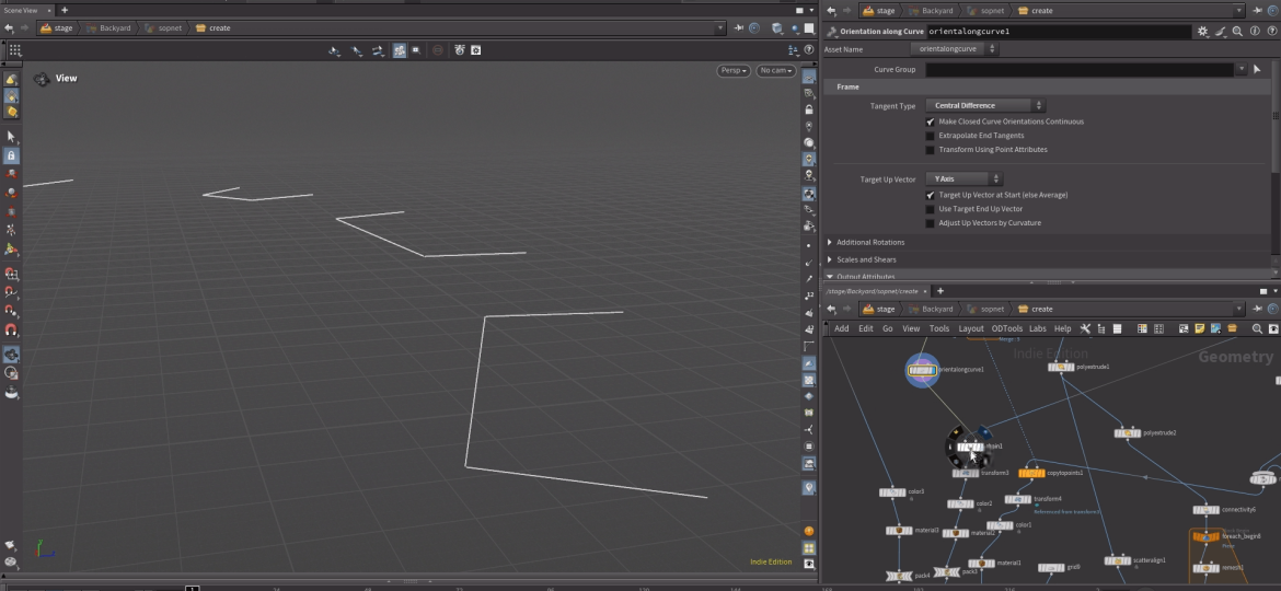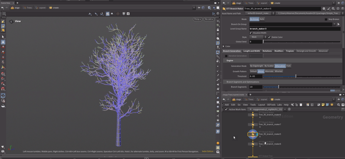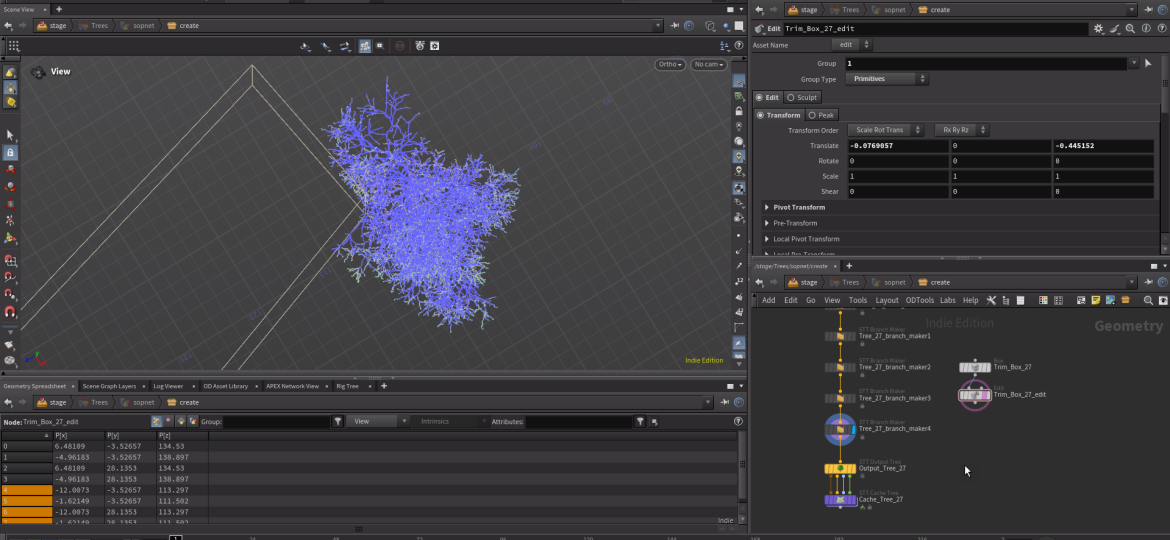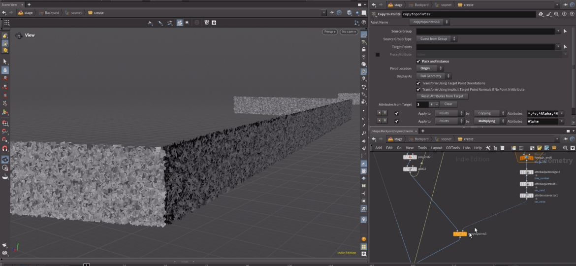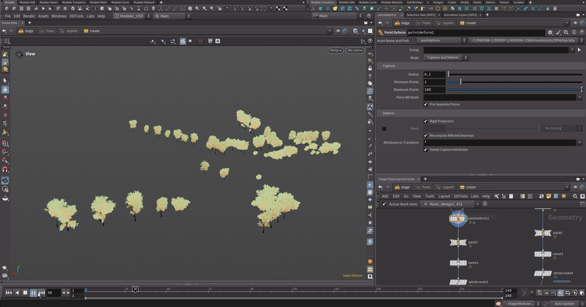 Wind animation was driven by procedural animation in SOPs with distance-falloff controls. Leaf atlases were assembled in COPs from Megascans textures.